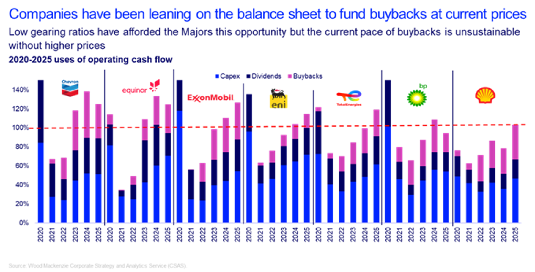 Buybacks are being wound back in a big way, with low oil prices limiting free cash flow after dividends. Collectively, the Majors have spent US$285 billion – 18% of the combined market cap – in the four years from 2022 to 2025. That bountiful period is now at an end.