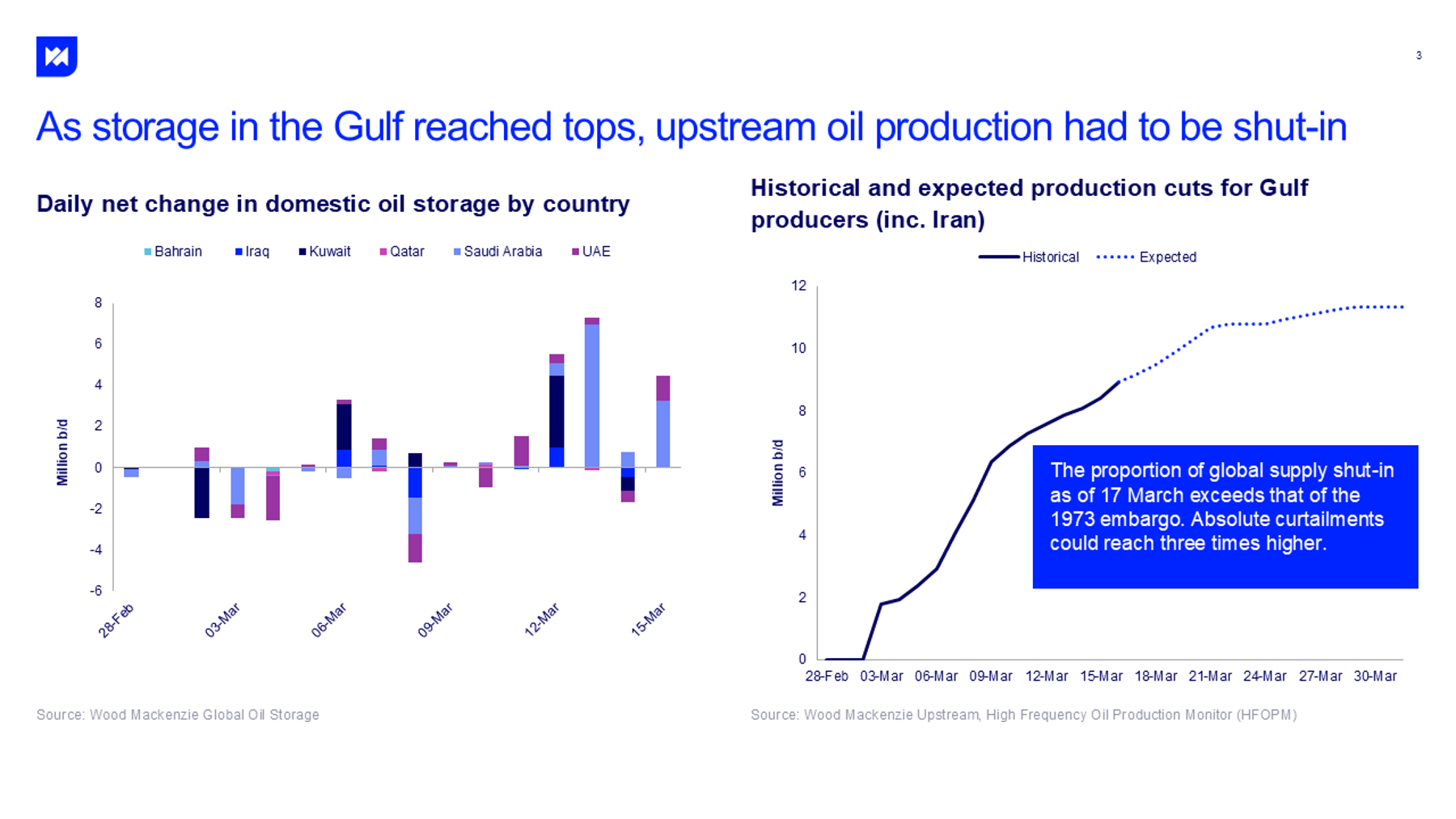 A lot higher. The oil market has been robbed of 15 million b/d of exports for almost three weeks, curtailments greater even than during the 1973/74 Arab oil embargo. Limited supply-side levers have only marginally eased the shortfall. The slow release of 400 million barrels from strategic petroleum reserves around the world and Saudi Arabia maximising spare capacity of the Yanbu East-West pipeline still leave the market short of at least 10 million b/d. Meanwhile, our data shows that storage capacity in the Gulf was filled by late last week, forcing producers to shut-in 9 million b/d of oil output across the region as of 17 March.