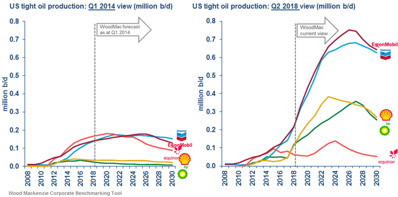 Tight oil is now an important driver of growth for most Majors. ExxonMobil, Chevron, Shell and BP have all assembled material tight oil assets that include the Permian; Equinor has sizeable Bakken exposure. Roy Martin, a research analyst in corporate research, expects the Majors’ combined tight oil production to climb from 0.7 million barrels per day in 2018 to a peak of 2.2 million in 2026. By then tight oil will be 10% of the Majors’ total production, representing one-fifth of liquids. It’s quite a shift from reliance on conventional and deepwater fields.
