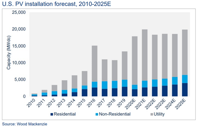 This comes from a fascinating and highly detailed report on the state of the US solar power industry. The point that struck me was that this is still going to be a good year for solar capacity additions, even though new residential installations have slumped because of the coronavirus lockdowns. Wood Mackenzie’s analysts expect total installations to remain robust over the next few years, despite the phased reduction in the value of the Investment Tax Credit for solar power.