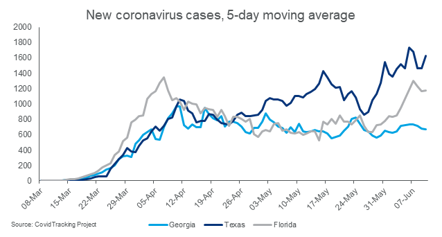 Every week I have been checking the data for new coronavirus cases in three of the US states that were among the leaders in opening up after the lockdowns of March and April. The news is mixed: Georgia still looks pretty good, with no sustained rise in new cases; Florida is less good, with a sustained increase in recent weeks, and Texas looks quite worrying. The number of new positive cases being reported in Texas hit a new record high on Wednesday. Some of the growth seems to be a result of increased testing, but the proportion of test results coming back positive also appears to have been on a rising trend since late May. The city of Houston is considering issuing new stay at home orders in response to the rise in cases, and is looking at reopening the temporary hospital that was set up in the NRG Stadium.
