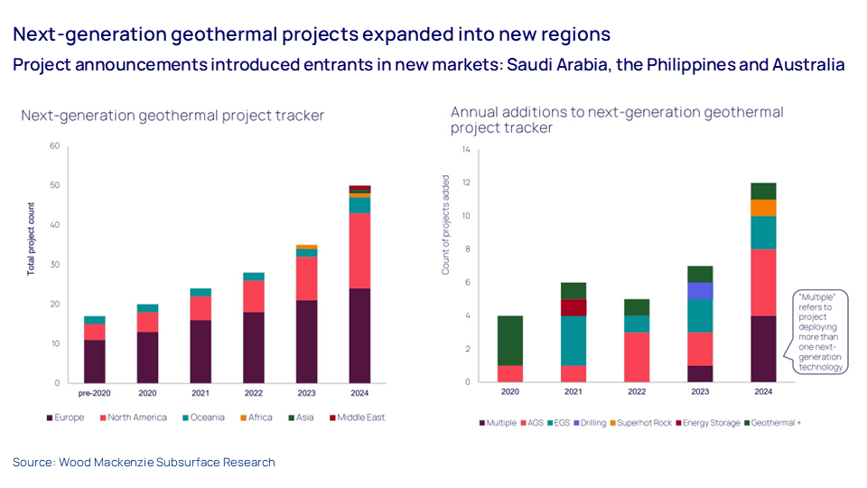 Kate Adie, Annick Adjei and Zoé Sulmont, analysts from Wood Mackenzie’s subsurface and energy transition teams, recently published an overview of the industry, highlighting some of the key developments of 2024. These charts show how next-generation geothermal has been gathering momentum, with the total number of active projects growing in most regions, and an acceleration in the number of new projects announced each year.