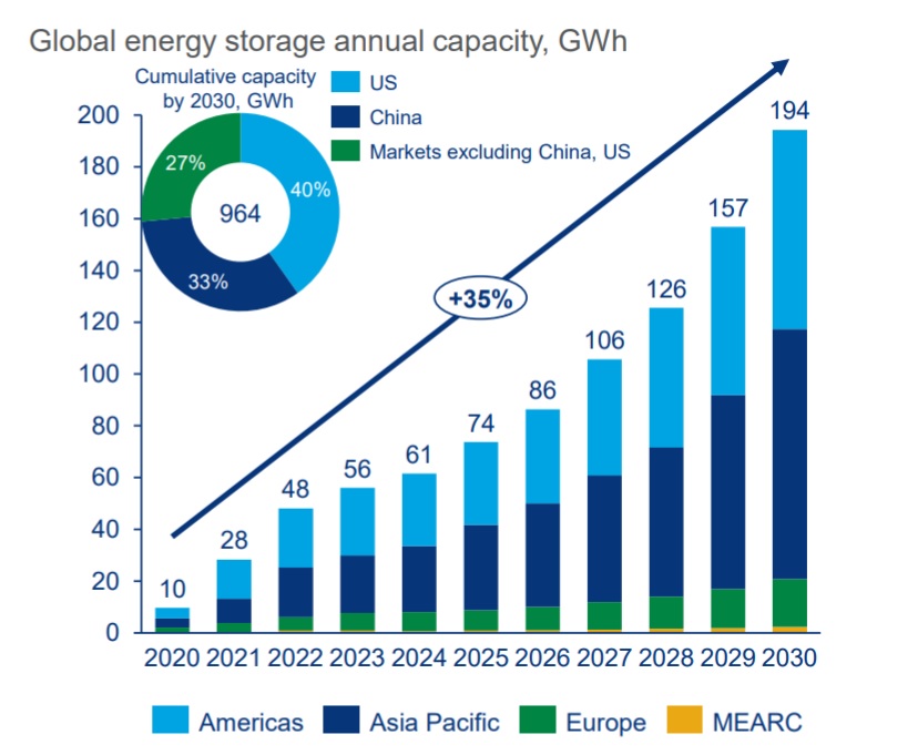 This comes from Wood Mackenzie’s latest Global Energy Storage Outlook, led by Le Xu, a senior analyst in our energy transition practice. It shows the rapid pace of growth in energy storage expected over the coming decade, and also underlines that just two countries are set to dominate the market: the US and China. In 2030, the US and China are between them expected to account for 73% of all installed energy storage capacity worldwide, with the rest of the world combined representing just 27%.