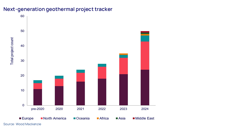 This comes from: Geothermal: the next North American goldrush? by Annick Adjei, Wood Mackenzie’s Senior Research Analyst for Subsurface (New Energies). The chart explains the note’s title: last year saw a surge of interest in next-generation geothermal in the US and Canada. Of the 15 new next-generation geothermal projects announced in 2024 around the world, eight were in North America.