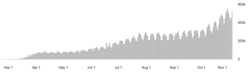 While Americans were focused on politics, the coronavirus has been attracting less attention, but the number of new cases reported each day has been rising fast. The US has now had about 9.5 million cases of Covid-19, with 121,000 reported on Thursday, a new record. Worldwide, there have been 47.9 million cases, and the number of new infections reported each day is still on a rising trend. Over the past week there have been about 500,000 cases a day reported to the World Health Organization, more than five times the number when the first wave was at its worst in the US and Europe in April.