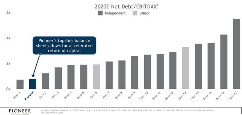This is a slide from the presentation given by Pioneer Natural Resources to discuss its third quarter earnings this week. It compares Pioneer’s debt position to a peer group including other large independent producers as well as ExxonMobil and Chevron. It makes the point that Pioneer wants to highlight: its balance sheet is in much better shape to withstand a downturn than most of its peers. It is also a reminder that much of the industry is under severe financial strain.