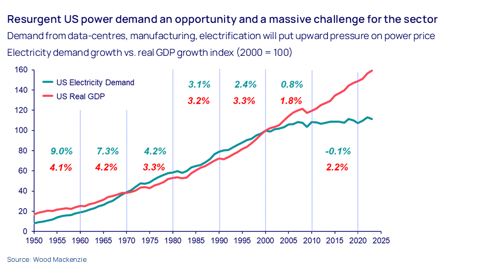 US power demand is sparking back to life. After two decades of managing pancake-flat demand, utilities and regulators will have to jump into action if they are to meet the burgeoning needs of big tech and manufacturing customers. I spoke to Chris Seiple, Vice Chair, Power and Renewables and author of our latest Horizons, about the opportunities and challenges for the US power industry.