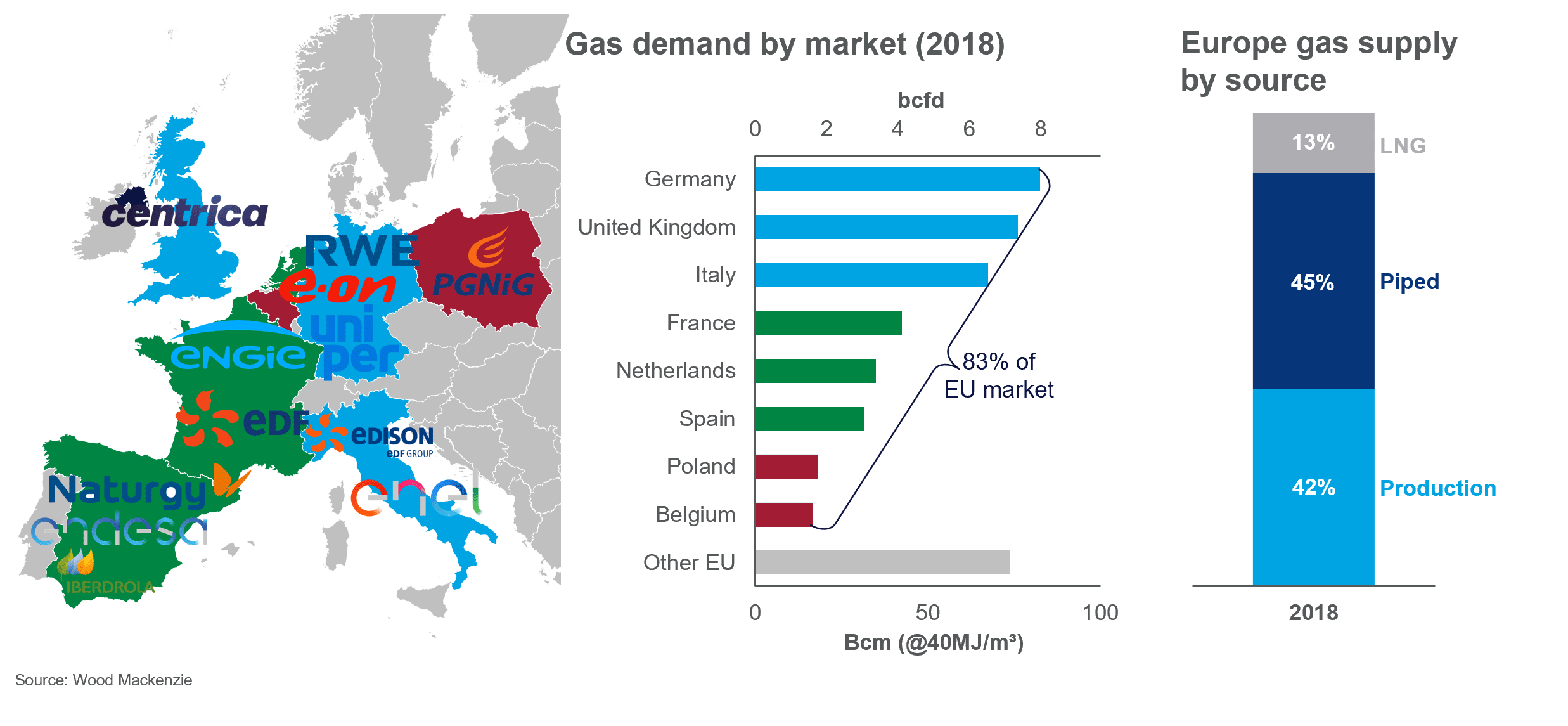 Utilities dominate the wholesale and retail sectors across Europe’s largest gas markets. Supplies are underpinned by long-term, legacy pipeline contracts.