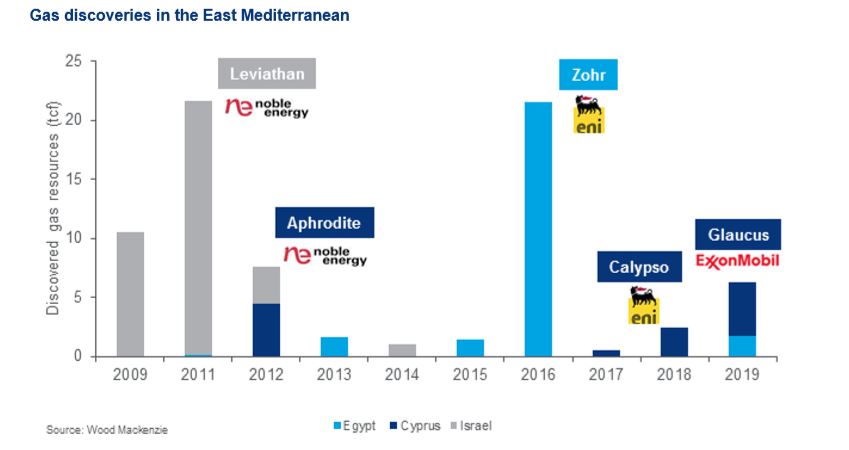 Cyprus has been a bright spot for exploration over the last seven years, with a string of giant gas discoveries including ExxonMobil’s Glaucus and Eni’s Calypso. In total, we estimate 11 tcf of recoverable gas resource has been discovered.