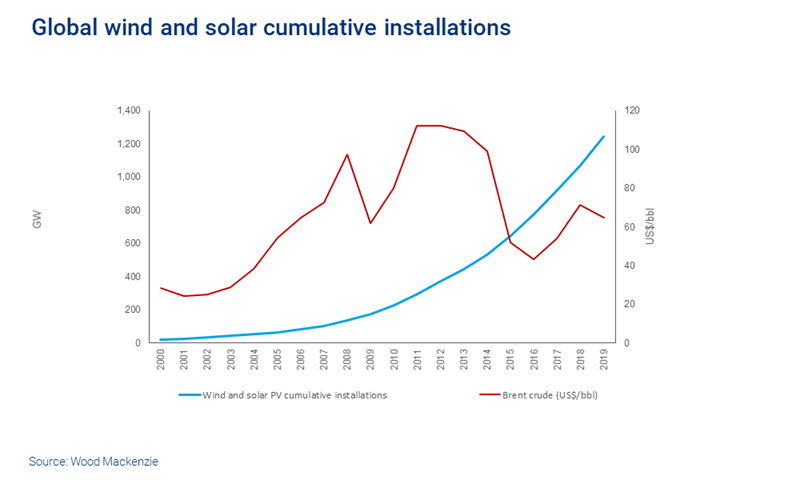 Historically, the oil price has shown no correlation with investment in renewables. The installation of both wind and solar continued to increase through the last oil price downturn.