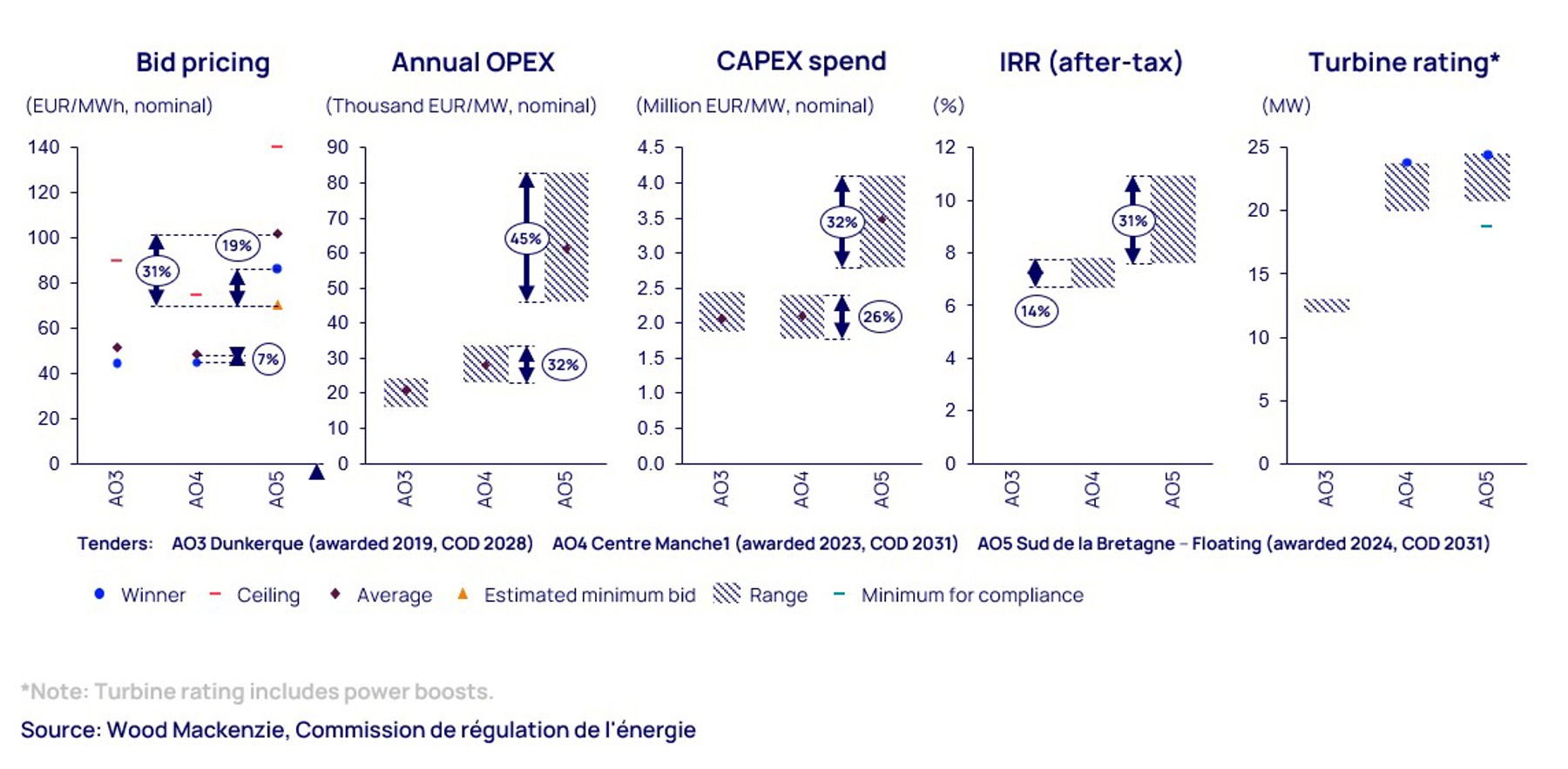 The AO5 Sud de la Bretagne tender has now concluded. This was the world's first commercial floating offshore wind tender, marking a significant step in commercialising floating offshore wind technology, and highlighting the industry's diverse approaches to costs and turbine sizing.