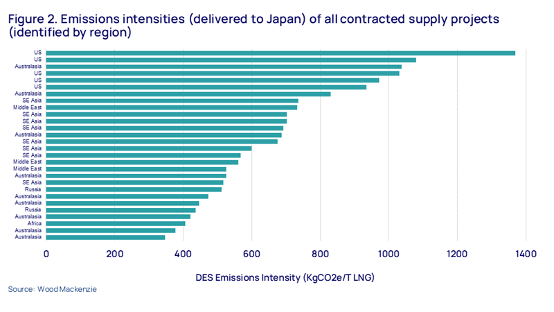 Japan currently has a wide range of LNG supply contracts; from very low emissions supply sources like PNG LNG to high emissions supplies from the US (Figure 2), and it is the balance of these different sources that dictates the overall intensity of the country’s supply portfolio.