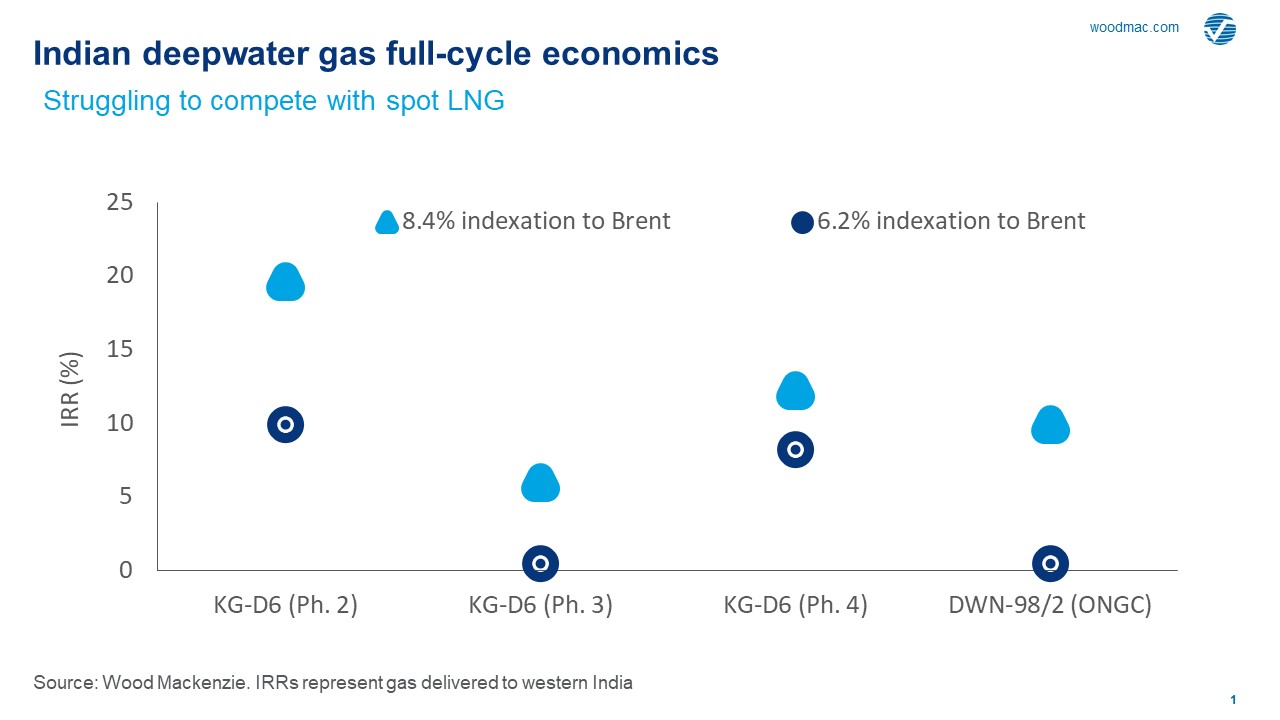 Reliance’s KG-D6 project benefits from better economics than ONGC’s KG-DWN-98/2 project, and the former has already sold an initial tranche of gas at 8.4% indexation to Brent, delivered into western states. However, lower indexation will be required to compete against spot LNG in Gujarat – current import prices are in the range of 6% of Brent.