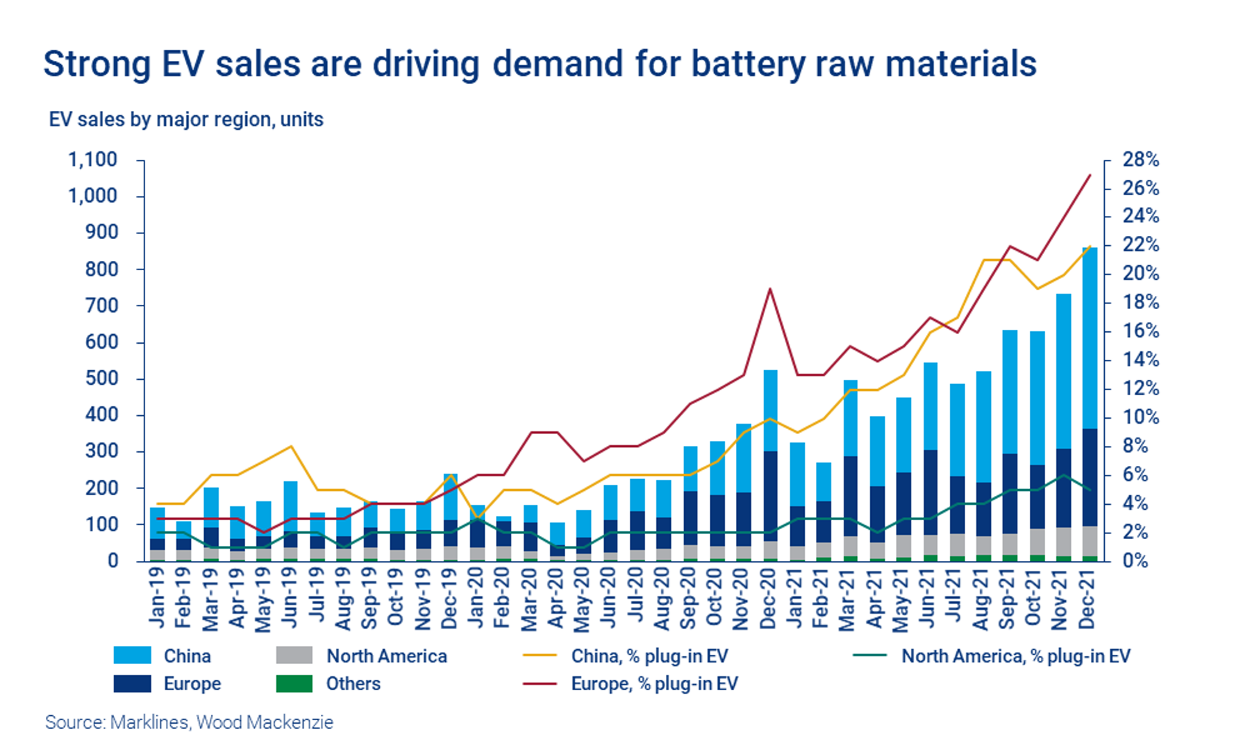 EVs account for the lion’s share of battery raw material demand and will continue to do so for some time. EV sales saw incredible growth in 2021, more than doubling to 6.5 million-plus units globally. Sales were particularly strong in the world’s two key markets, Europe and China, which bought a combined 84% of all electric passenger cars.
