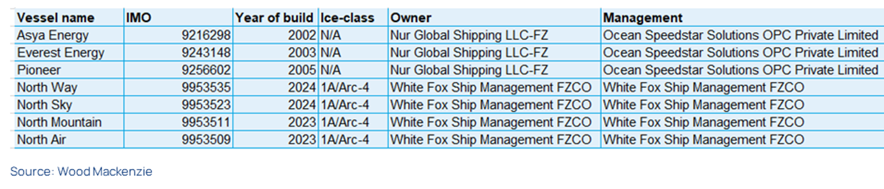 Each of the ships have recently changed ownership and are suspected of being part of Russia’s emerging “dark” fleet of LNGCs. Wood Mackenzie understands that Asya Energy, Everest Energy, and Pioneer are currently owned by Dubai-registered, Nur Global Shipping LLC-FZ. However, ownership of these vessels may have been transferred to new, Dubai-registered entities, which may explain why Nur Global Shipping LLC-FZ has not been added to the SDN list. In any event, we expect that any LNGCs suspected of serving Arctic LNG-2 or forming part of the "dark" fleet, such as New Energy and Mulan, will be targeted by US sanctions in the near future.