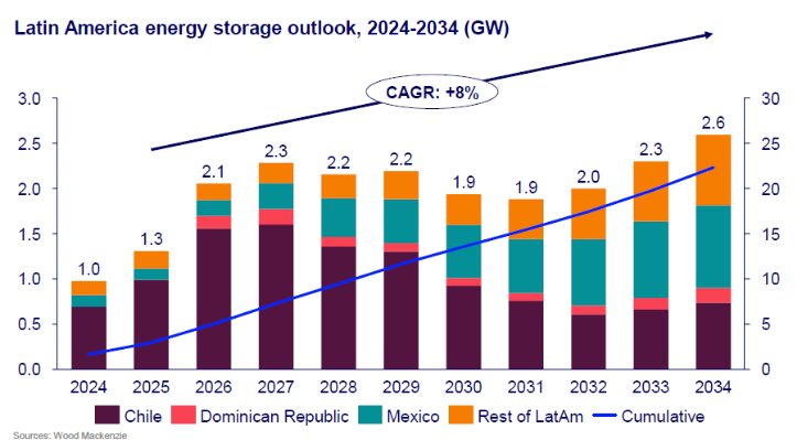 The Latin American region will see a compound annual growth rate of 8% for its energy storage market through 2034, reaching a total of 23 gigawatts (GW), according to Wood Mackenzie’s Latin America Energy Storage Outlook 2025.