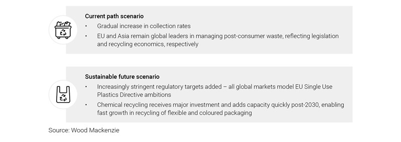 Wood Mackenzie ran two scenarios focused on the major packaging polymers - polyethylene (PE), polypropylene (PP) and polyethylene terephthalate (PET) - to answer this question. A ‘Current Path’ scenario represents the world if it continues as it is today, while a ‘Sustainable Future’ scenario sees more stringent legislation implemented to incentivise companies to be ambitious.