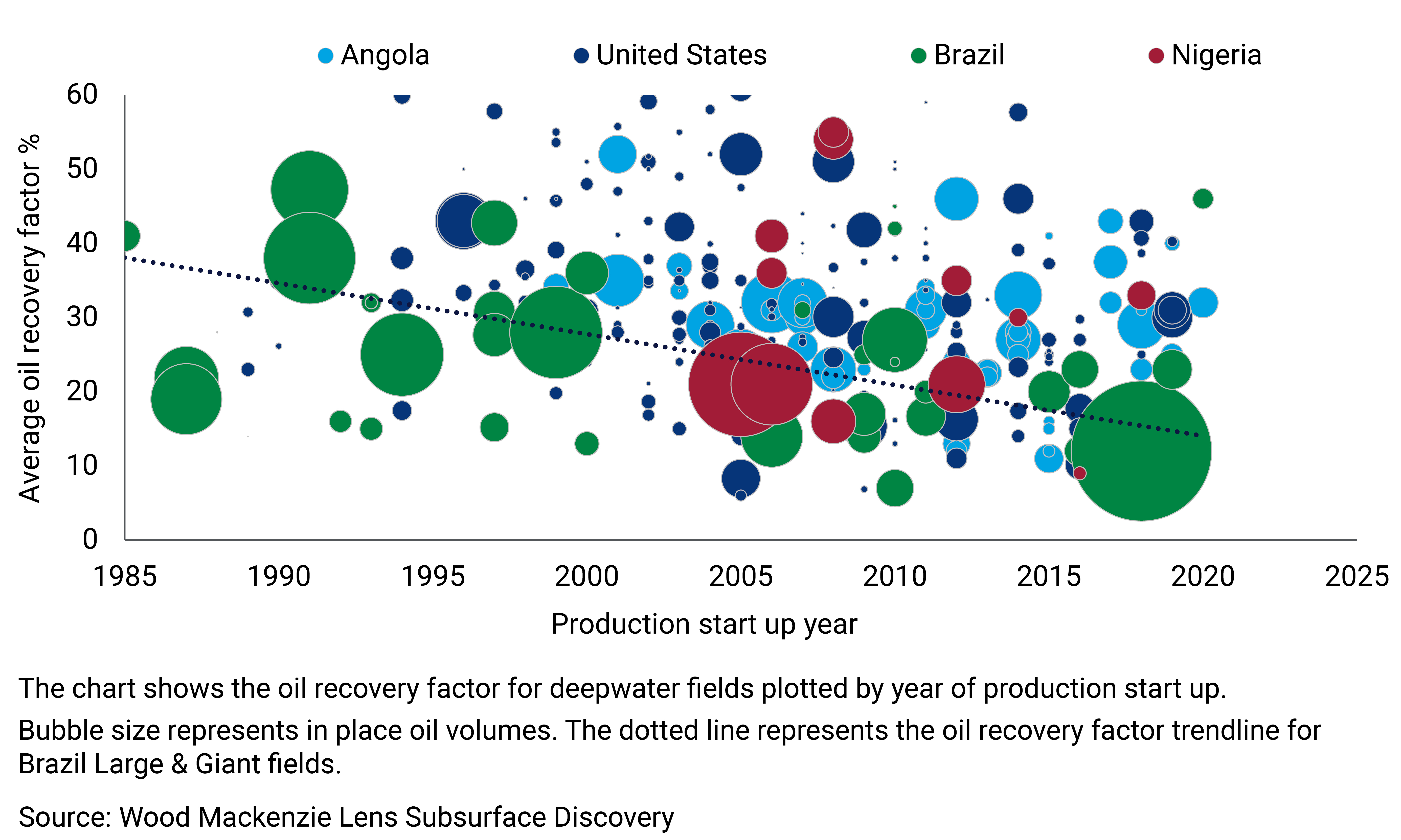 Why does understanding the oil landscape with this level of specificity matter? Because it offers visibility into data that others cannot see, and can perhaps, help investors or operators capture value, upside, and opportunity that may otherwise go unnoticed. In the case of Wood Mackenzie’s analysis, understanding what attributes impact oil recovery factors helped answer their pointed question, ‘Which countries have the best performing deepwater reservoirs?’ “We found that 80% of the remaining deepwater oil resources will come from five countries (Brazil, US, Gulf of Mexico, Guyana, Nigeria, and Angola), therefore, understanding the quality of their reservoirs is key to identifying who has the best oil,” added Dr Andrew Latham, Vice-President Subsurface Research for Wood Mackenzie. Lens Subsurface Discovery showed that Brazil and Angola have the lowest recovery factors, but that they also have the potential to improve this using various technologies and techniques.