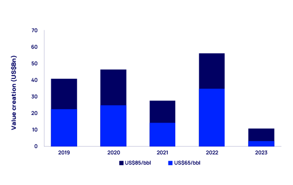 The industry’s exploration economic performance has been attractive since upstream costs reset a decade ago. Full-cycle returns have been consistently in double digits every year since 2015, averaging 15%. We value new field discoveries at much more than they cost to find, with net value creation of over US$160 billion since 2015, assuming an industry planning price of US$65/bbl Brent long term (almost double the current market value of supermajor BP). Even the relatively modest performance of 2023 is ripe for an upgrade as the best of these recent discoveries are appraised and move towards development.