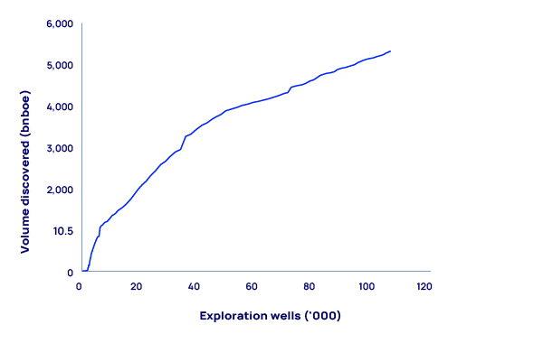 First, creaming curves. These plot cumulative volumes found against cumulative exploration wells drilled and provide a measure of resources found per well. While the industry has been finding rather less in recent years compared with previous decades, that is down to drilling fewer wells. The global creaming curve reveals a near straight-line trajectory with a steady gradient of around 30 million boe discovered per well, including the dry holes. It is a trend unchanged over the past four decades and more than 50,000 wells. An abrupt decline in such a long-established trend seems unlikely.