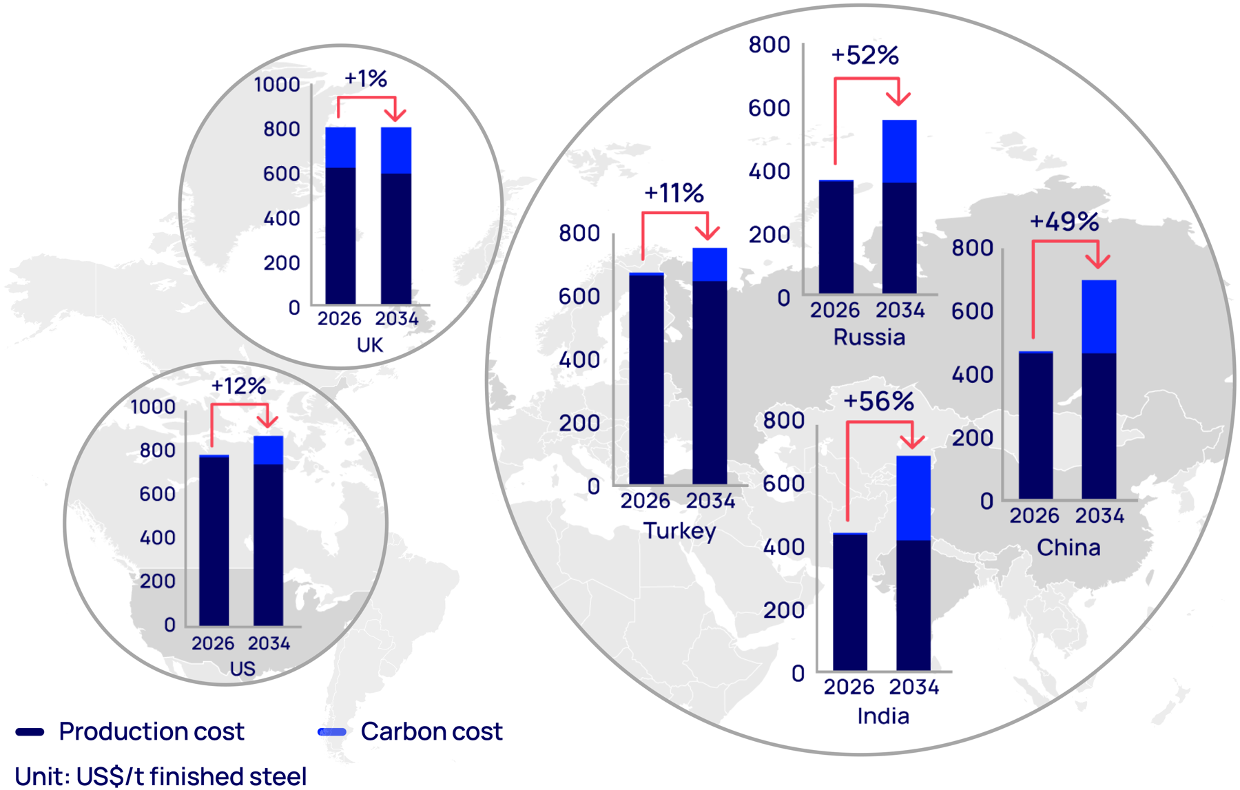 Figure 3: CBAM-induced increase in the cost of delivered steel to the EU by 2034