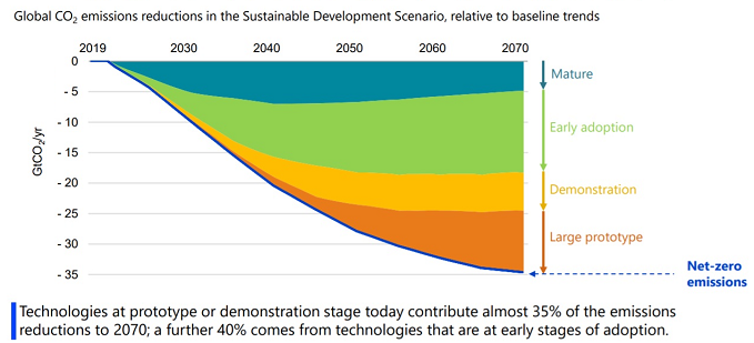 This comes from the International Energy Agency’s recent report on clean energy innovation, showing why more progress is needed in technologies to cut greenhouse gas emissions. The shaded area shows a scenario for how global emissions could be reduced to net zero by 2070, broken down by the current maturity of the technology. The IEA suggests that only 25% of the potential emissions reductions might come from technologies that are already mature, and about 35% might come from technologies that are at either the prototype or demonstration stage. Several companies and countries have pledged to cut emissions more quickly, to achieve objectives for being at net zero by 2050, but the IEA warns that there is a disconnect between those goals and the technologies that are currently available. It adds: “Without a major acceleration in clean energy innovation, net-zero emissions targets will not be achievable.”