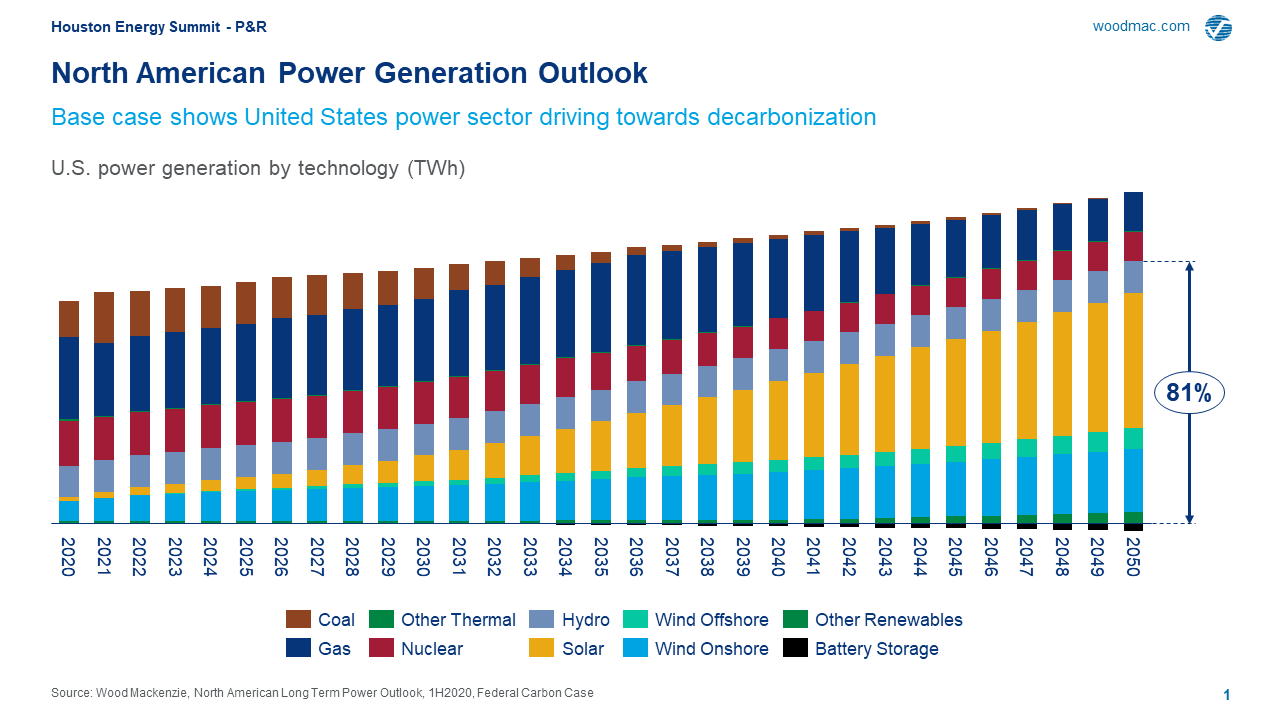 This is taken from a slide that I presented this week, provided by Dan Shreve from Wood Mackenzie’s power and renewables team. It shows our projection for the fuel mix in US power generation over the next 30 years, in our base case forecast. You can see how additions of new wind and solar capacity are expected to dominate investment in power generation, and how coal-fired power is set to dwindle away to almost nothing in the 2030s. The 81% on the right is the proportion of US electricity that we expect to be generated from renewable sources in 2050.