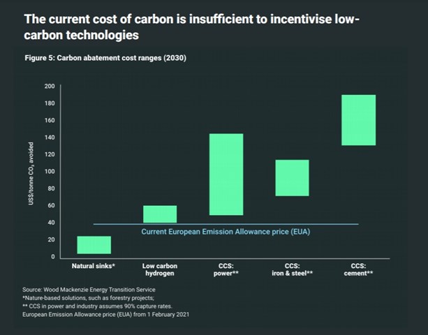 This comes from the latest in our Horizons series analysing the big subjects in energy and natural resources. The report, by Murray Douglas, a research director in the Europe gas team, looks at the EU’s hugely ambitious goal of cutting greenhouse gas emissions by 55% by 2030, as a milestone on its road to net zero by 2050. One of the crucial conclusions on achieving that objective is that the price of carbon will have to be significantly higher than it is today. For deep decarbonisation, technologies including low-carbon hydrogen and carbon capture in the power, steel and cement industries will have to be widely used. But as this chart shows, even at their lowest estimated costs, these technologies generally need carbon prices higher than their current levels in the EU’s emissions trading system.