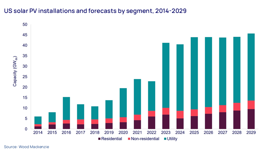 As the chart shows, that is a particularly impressive feat given how sharply demand has increased over the past couple of years. Wood Mackenzie is now projecting that US solar installations will level off out to the end of the decade, but will remain at these relatively high levels. Take a look at the full Insight report for a lot more detail on the US solar market.