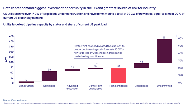 Our tracking shows US utilities have committed to add 116 GW of large loads to their networks, equivalent to approximately 20% of total US electricity demand in 2024. Vertical utilities are building all of the 16 GW under construction, while the rest is concentrated in two major power markets, PJM (the Mid-Atlantic region) and ERCOT (Texas). This is the tip of the iceberg, with an additional 32 GW that utilities are representing to investors as ‘high confidence’ of being built and a further 277 GW with an undisclosed commitment status.