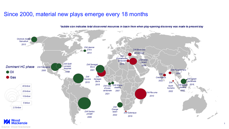 Billion barrels of oil equivalent (boe) discoveries are emerging every 18 months on average this century.  The biggest resource capture theme outside of US shale has been the push into under-explored frontiers in search of big fields, typically in ever-deeper water. It’s been highly successful for the first movers and fast followers.