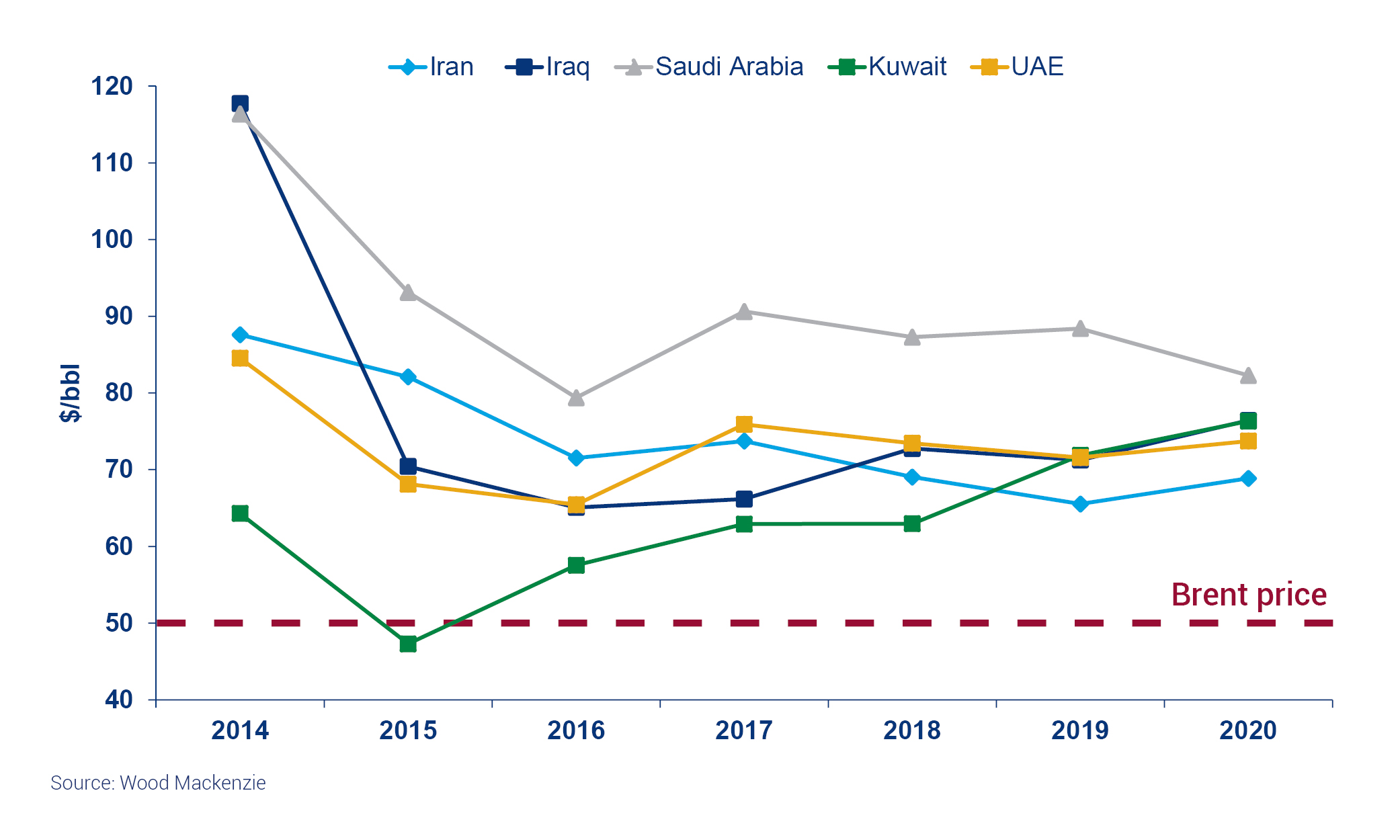 The combination of lower production and a low price is proving difficult for OPEC members. Fiscal breakeven for Middle East producers is in excess of US$70/bbl on average, even with government spending restraint. Any short fall is funded by running down official reserves, tapping international capital markets, or finding tax revenues from elsewhere which takes time.