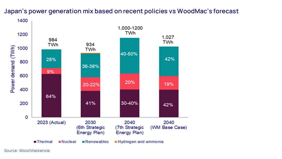 Japan remains fully committed to its 2050 net zero goals but is prepared to be pragmatic about how these are delivered. The previous target of up to 38% renewables (excluding nuclear) in the generation mix by 2030 from 26% in 2024 has now been pushed back by five to seven years as high costs, lengthy permitting processes and limited land availability slow the pace of growth. The latest plan now aims for 40% to 50% renewables by 2040, a more realistic target that aligns with Wood Mackenzie forecasts.
