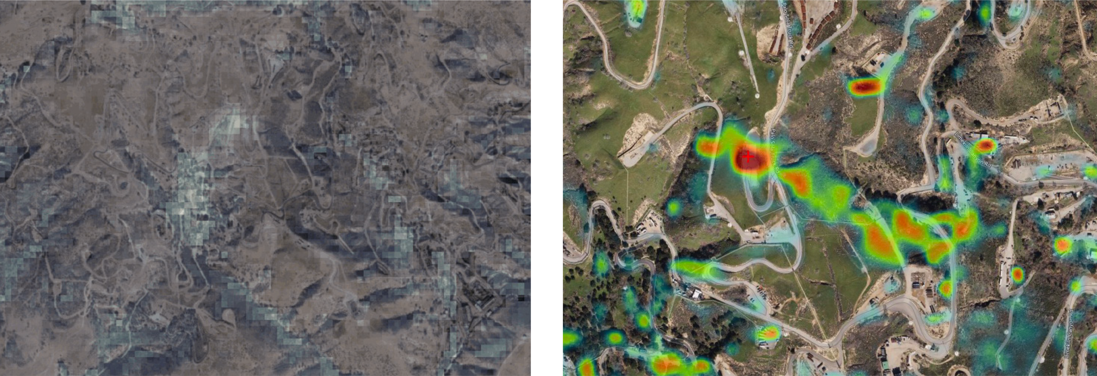 These images show a large methane leak in California. The image on the left shows the kind of methane emissions view that is possible with Sentinel 2 data with 20 metre resolution. It does not offer sufficient geographical and temporal resolution to accurately quantify methane. The image on the right shows AVIRIS-NG data overlaid with high-resolution satellite data. This offers better resolution, but the airborne sensor has to be targeted at a specific leak, with a significant trade-off on coverage and comparability. Neither solution can detect smaller leaks