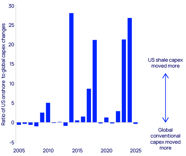 Companies can lean into price strength, pull back in price weakness or go countercyclical quickly and boldly when service costs are low. At times, those advantages have allowed US shale capex to accelerate 20 times faster than global conventional investment.