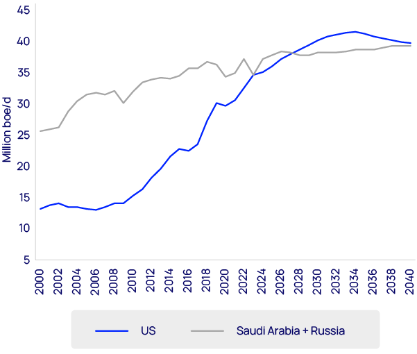 On more than one measure, the US is already dominant. US oil production – including crude, condensate and natural gas liquids – has risen nearly three-fold over the past 15 years and now accounts for 20% of all global supply. US natural gas production has doubled since 2005 and now makes up a quarter of global output. In fact, the US now produces more hydrocarbons than its two largest competitors combined, and its dominance of world production is set to increase over the next decade.