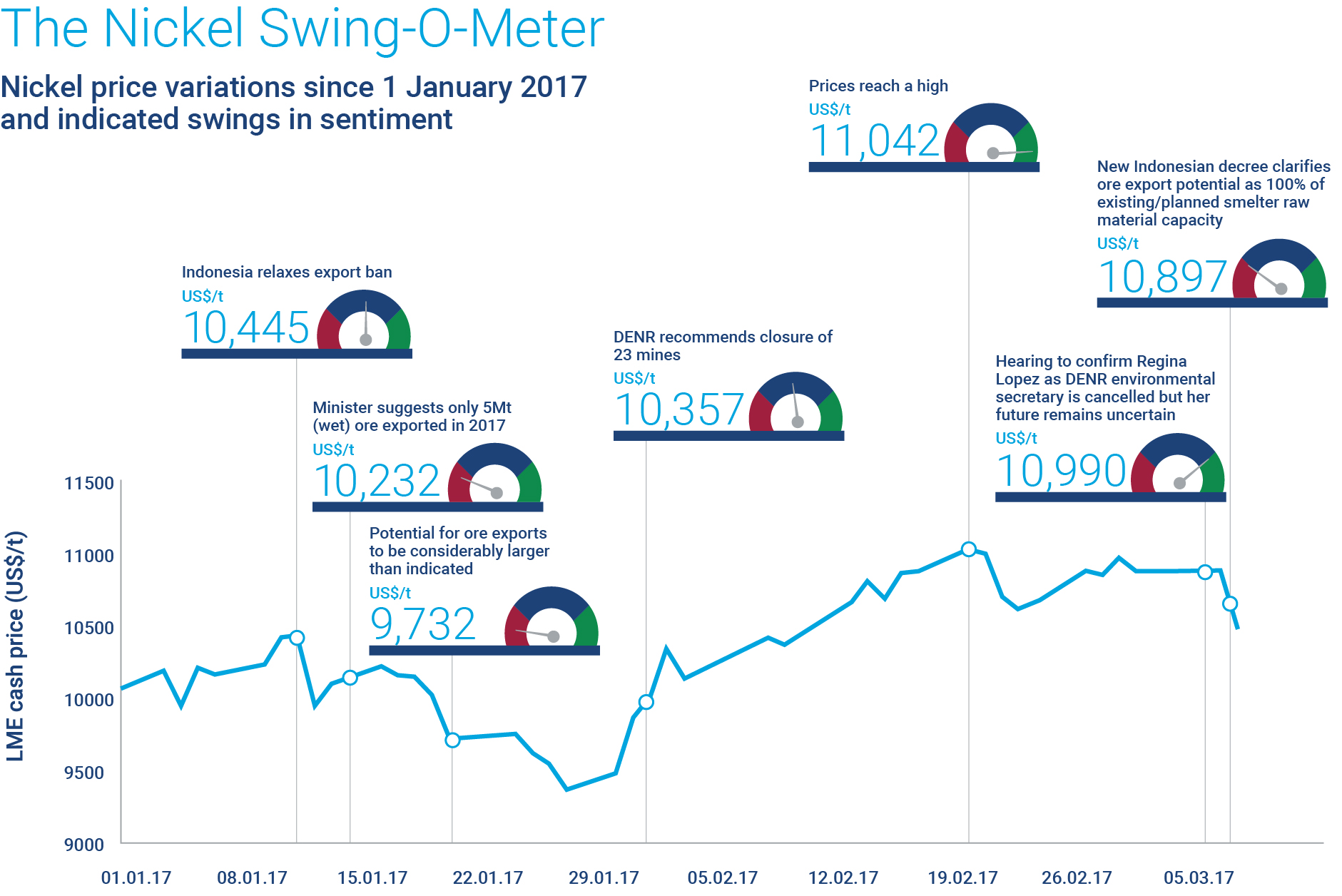 Since 1 January 2017, the nickel price has swung wildly on sentiment alone. Facing a relaxed export ban in Indonesia and potential mine closures in The Philippines, a great deal of uncertainty surrounds the market, which feeds China’s nickel pig iron (NPI) production and thus, the market for stainless steel.