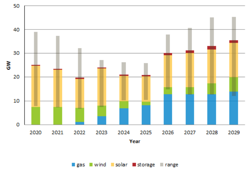 Figure 2: Forecasted queue volume (GW) and generation composition through 2029