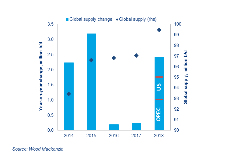 Back in January 2017, we argued that OPEC would roll over its agreement through H2 2017. On that basis, we forecast Brent would average US$55 per barrel (bbl) this year.  We analysed 2018 on the basis of no production cuts next year. The annual average price for Brent was forecast at US$50/bbl on this basis because, as the chart above shows, total oil supply would grow 2.4 million b/d in 2018 compared with world oil demand growth of 1.2 million b/d year-on-year in 2018.