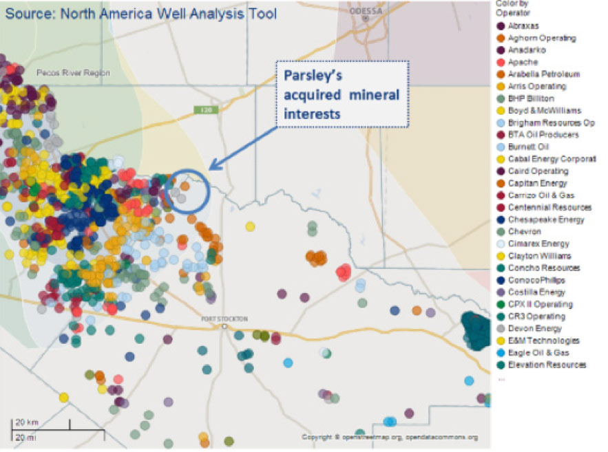 Our well analysis tool pinpoints Parsley's mineral rights positioning within the southern Delaware, still considered somewhat exploratory.