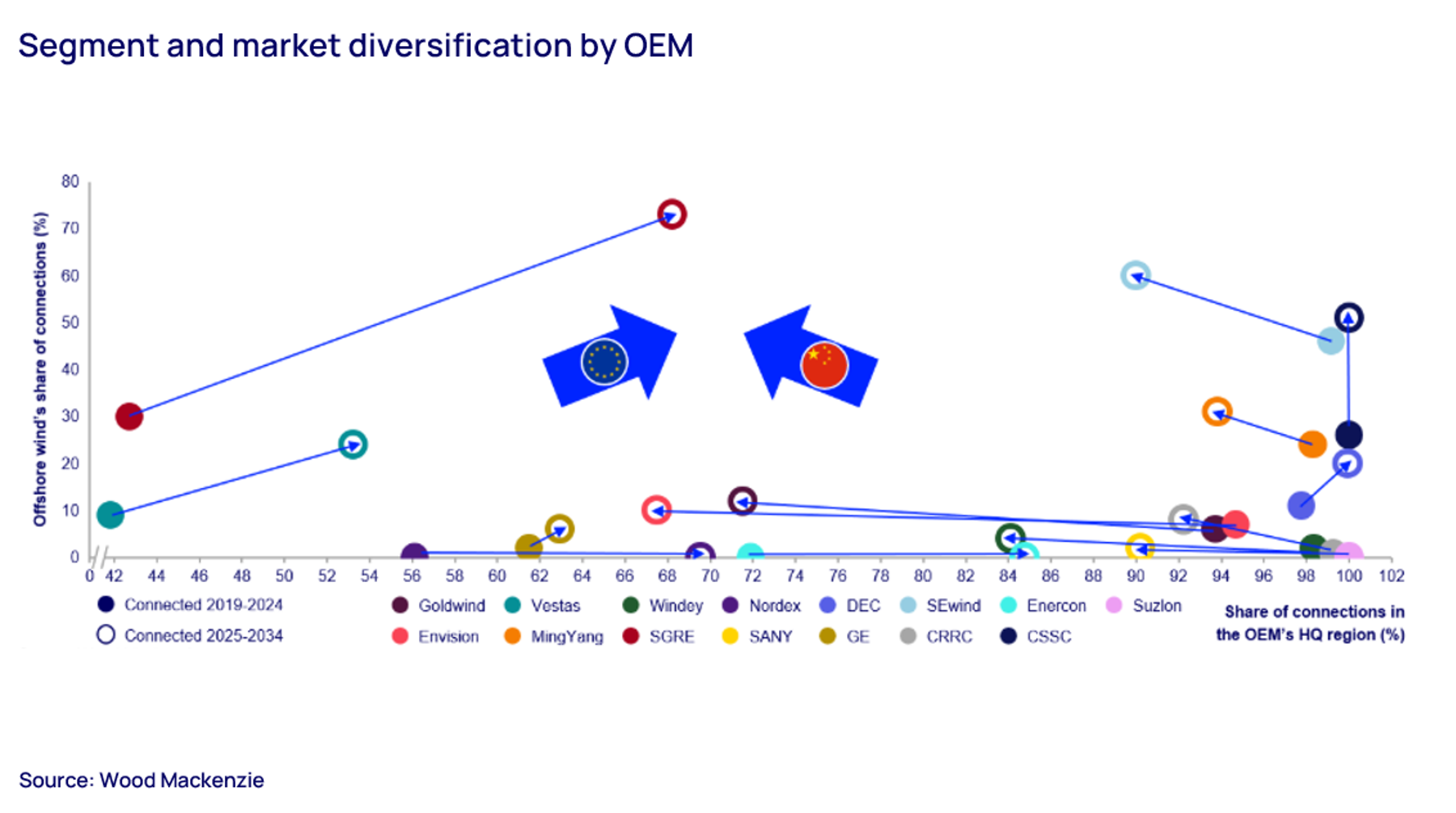 中国OEMは、力強い国内成長、積極的な世界進出戦略、コスト優位性(欧米の競合他社と比較して最大32%低)を活用し、非常に大きな市場シェアを獲得しています。世界トップ企業は中国企業のゴールドウィンドとエンビジョンになると予測され、それぞれが今後10年間で200GW以上の設備を設置予定です。そして、同じく中国企業のミンヤンとウィンディが5位内に入るとされています。