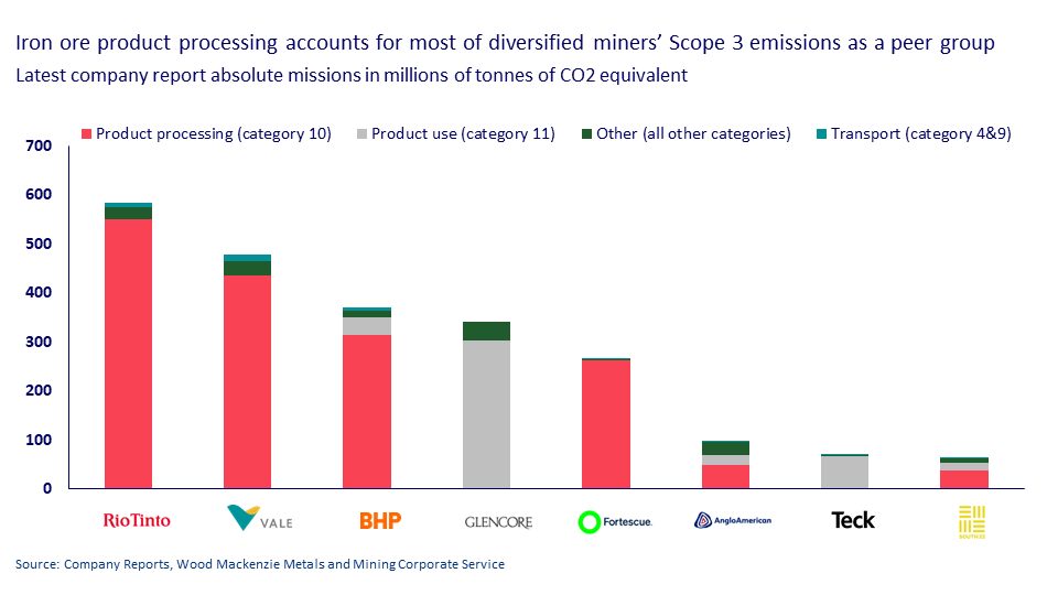 Product processing, particularly of iron ore, is responsible for the majority of scope 3 emissions in diversified mining, as well as for the lion’s share of most miners’ individual emissions (see chart below). The exceptions are Glencore and Teck, whose scope 3 emissions are heavily concentrated towards product use from their coal-weighted portfolios.