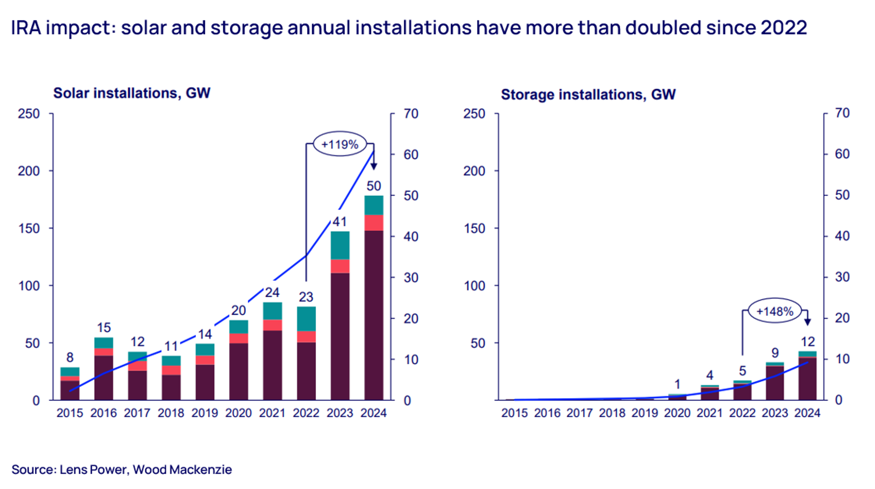 The Inflation Reduction Act (IRA) has had significant impact on the energy industry already. Solar and storage installations in 2024 were doubled 2022, but this success is under threat. Political uncertainty and policy shifts under a Trump administration have the potential to disrupt the industry. Potential modifications to the IRA could lead to a steep decline in renewable investments causing a reduction of 30% or more. But despite these concerns, buyers are showing a willingness to pay a premium for renewable energy. Continued willingness to pay that premium will be important to the industry as revenue for both solar and wind, if it was forced to compete based on wholesale power prices, declined significantly in 2024 in most markets due to lower gas prices and increased renewables penetration.