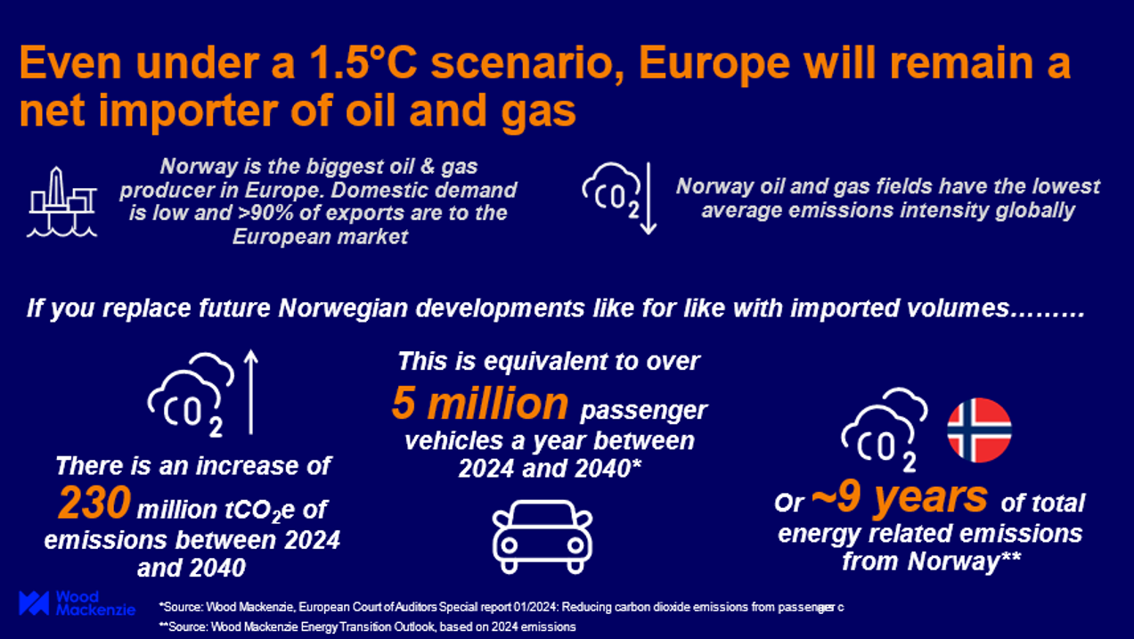The study highlights the challenges faced in managing the complexities and long-term undertaking of the Energy Transition, and the need to focus on meeting the continued demand for fossil fuels whilst mitigating emissions during their production, transportation and consumption. Norwegian oil and gas, through electrification of its developments powered by renewable energy and strict methane management, coupled with proximity to the market results in oil and gas that is supplied to the market with a lower emissions intensity than alternative sources. The overall impact of curtailing production from the Norwegian Continental Shelf results in higher absolute emissions.