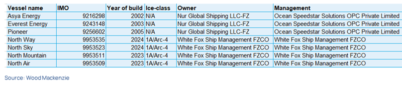 Each of the ships have recently changed ownership and are suspected of being part of Russia’s emerging “dark” fleet of LNGCs. Wood Mackenzie understands that Asya Energy, Everest Energy, and Pioneer are currently owned by Dubai-registered, Nur Global Shipping LLC-FZ. However, ownership of these vessels may have been transferred to new, Dubai-registered entities, which may explain why Nur Global Shipping LLC-FZ has not been added to the SDN list. In any event, we expect that any LNGCs suspected of serving Arctic LNG-2 or forming part of the "dark" fleet, such as New Energy and Mulan, will be targeted by US sanctions in the near future.