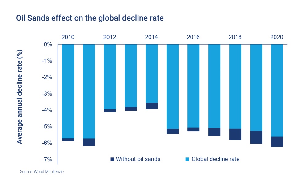 Dr Gibson said: "Canada's oil sands and Brazil's deepwater pre-salt play are adding a growing proportion of production, significant enough to offset global decline rates. The oil sands alone could reduce decline rates by as much as 0.6% in 2020."