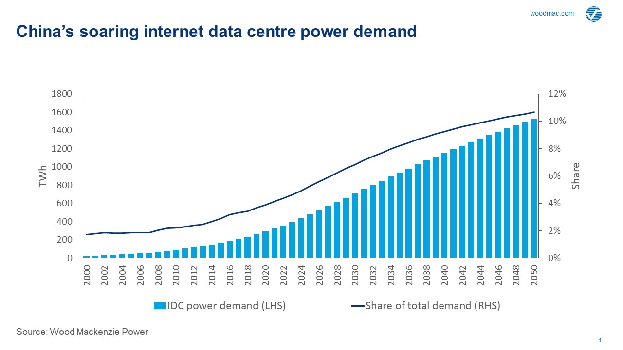 China's data centres are expanding rapidly. In 2019, they consumed 265 TWh of electricity, or 3.7% of the country’s total power demand. WoodMac’s China Power & Renewables team are expecting that these demand centres will consume more than 500 TWh by 2025, rising to over 1,500 TWh by 2050, making up 5.5% and 10% of total electricity demand, respectively.