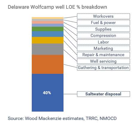 Saltwater disposal costs are estimated at 40% of total Delaware Wolfcamp well lease operating expenses. To target a deep injection formation more than 14,000 feet for saltwater disposal, the cost can surpass $10 million a well.