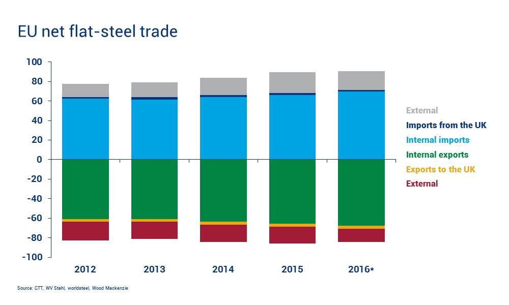 But this is not the whole trade story — the UK’s total flat steel imports stood at just over 5 million tonnes in 2016, while exports totalled 2 million tonnes. Of the 5 million tonnes imported by the UK, 80% came from the EU. A similar proportion of UK flat steel was exported back to the continent.