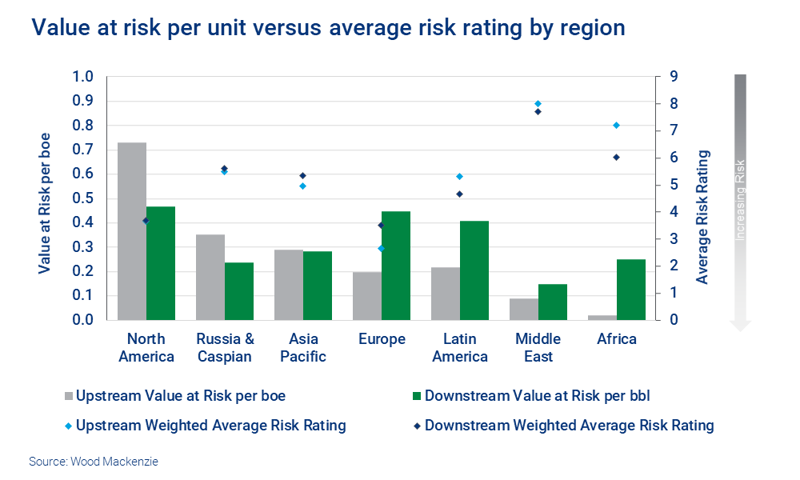 Overall, downstream operations have a slightly lower value at risk per unit than upstream operations. Refining assets tend to be more concentrated in regional hubs, whereas upstream assets are more distributed, based on the resource potential of different countries. Relative risk varies by region, so the two sets of operations have different risk exposure.